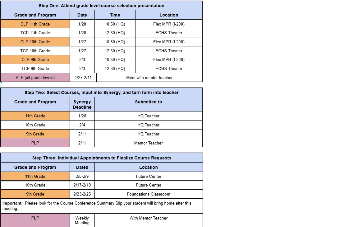 2026/2027 Course Selection Rollout In the next few weeks, ECHS Student Services will be going over course selection for Fall 2026/Spring 2027. TCP and CLP students will attend a presentation, fill out and submit a course request form, and then meet with their academic advisor to finalize their course requests. PLP students will complete the same steps with their Mentor Teacher. See below for the dates. An email with more details will be sent next week.